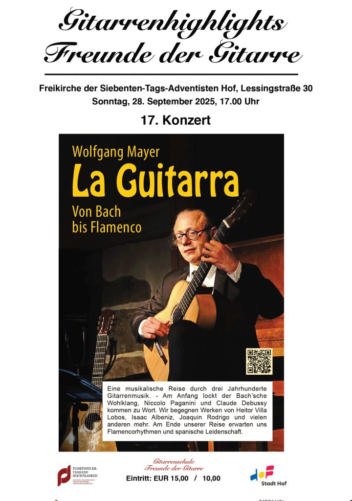 La Guitarra – Von Bach bis Flamenco‚ heisst das Programm von Wolfgang Mayer, mit welchem er zu Gast in Dietmar Ungeranks „Gitarrenhighlights“ sein wird. Am 28.09.2025 um 17:00 Uhr konzertiert der deutsche Gitarrist in der Freikirche der Siebenten-Tags-Adventisten in Hof (Lessingstraße 30). Kompositionen von Johann Sebastian Bach, Niccolo Paganini, Joaquin Rodrigo u.v.a. werden zu hören sein – eine musikalische Reise durch drei Jahrhunderte Gitarrenmusik. Am Anfang lockt der Bach’sche Wohlklang, Niccolo Paganini und Claude Debussy kommen zu Wort. Wir begegnen Werken von Heitor Villa Lobos, Isaac Albeniz, Joaquin Rodrigo und vielen anderen mehr. Am Ende unserer Reise erwarten uns Flamencorhythmen und spanische Leidenschaft. „Die Gitarre ist wie ein kleines Orchester – betrachtet durch ein verkehrtherum gehaltenes Fernglas.“ (Andrés Segovia)