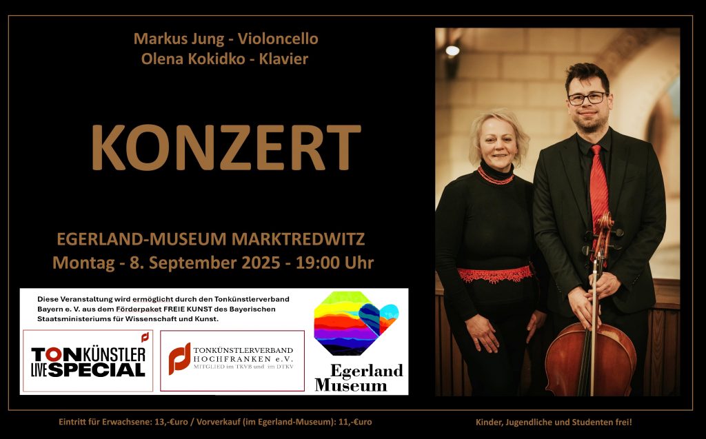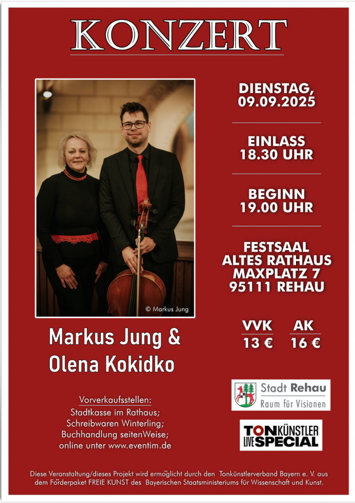 Am 8. und 9. September 2025 jeweils um 19:00 Uhr kommen Markus Jung (Violoncello) und Olena Kokidko (Klavier) nach Rehau und Marktredwitz. Das Duo spielt im Festsaal des Alten Rathauses Rehau und im Saal des Egerland-Kulturhauses (Egerlandmuseum) und gibt ein Programm bekannter Melodien vom Barock bis zur Romantik. Es handelt sich um Verantstaltungen der freistaatlichen Förderung „Tonkünstler Live Special“ 2025. Das Konzert in Marktredwitz kostet im Vorverkauf (im Museum) 11,-€ und 13,-€ an der Abendkasse, das Konzert in Rehau kostet im Vorverkauf 13,-€ und 16,-€ an der Abendkasse. Der Vorverkauf Rehau findet in der Buchhandlung seitenWeise (Bahnhofstraße 4) und bei Schreibwaren Winterling (Ludwigstraße 16) sowie an der Stadtkasse im Rathaus statt. Außerdem kann man bei Eventim online Tickets erwerben: https://www.eventim.de/eventseries/projects4cellos-die-vier-evangcellisten-3908426/ . Herzliche Einladung! Diese Veranstaltungen werden ermöglicht durch den Tonkünstlerverband Bayern e.V. aus dem Förderpaket FREIE KUNST des Bayerischen Staatsministeriums für Wissenschaft und Kunst.