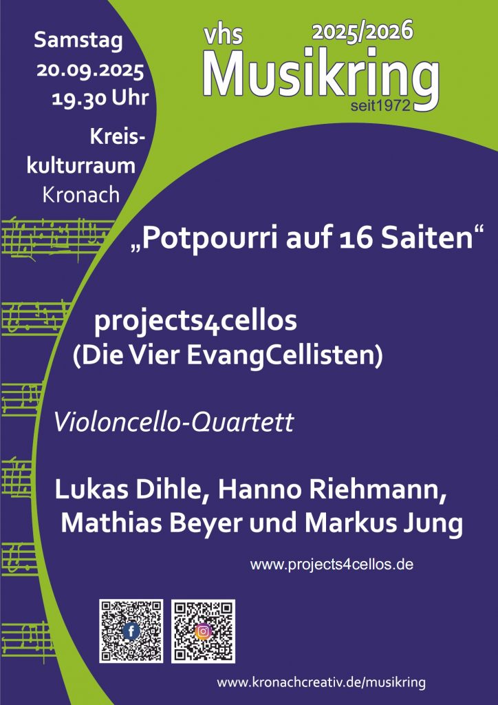 projects4cellos (Die Vier EvangCellisten) kommen erstmalig nach Kronach. Am 20. September 2025 spielt das Ensemble im Kreiskulturraum und gibt unter dem Namen „Potpourri auf 16 Saiten“ ein Crossover-Programm zwischen Klassik, Oper, Weltmusik und Jazz zum Besten. Damit eröffnet es die Konzertsaison 2025/2026 des vhs Musikrings Kronach, der seit 1972 besteht. Der TKV Hochfranken unterstützt hierbei logistisch den traditionsreichen Musikring. Beginn ist 19:30 Uhr – Herzliche Einladung in die Siechenangerstraße 13 in 96317 Kronach!