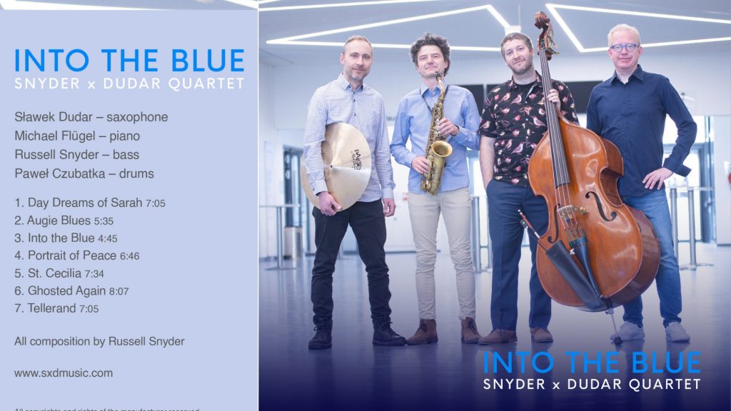 Mit großer Freude möchten die vier Musiker Ihnen ihr neuestes Album „INTO THE BLUE“ vorstellen. Aufgenommen im Mai 2025, präsentiert das Debütalbum des Snyder x Dudar Quartet originale Kompositionen des Bassisten Russell Snyder. Tief in der Jazztradition verwurzelt, erkundet jede Komposition Themen wie Liebe, Verlust und Hoffnung durch fesselnde harmonische Sequenzen, rhythmische Spannung und prägnante melodische Linienführung. Das Snyder x Dudar Quartet ist eine einzigartige Mischung internationaler Talente. Aufbauend auf der Freundschaft des polnischen Saxophonisten Slawek Dudar und des amerikanischen Bassisten Russell Snyder verbindet die Gruppe europäische Empfindungen mit traditionellen amerikanischen Improvisationsstilen. Zu diesem Konzept tragen die reichen Harmonien des deutschen Pianisten Michael Flügel sowie der treibende Puls des polnischen Schlagzeugers Pawel Czubatka bei. Seinen ersten Auftritt hatte das Ensemble am 4. April 2025 im legendären Jazzstudio in Nürnberg. Das offizielle Debüt fand beim Finale des Hof Jazz Nights Festivals 2025 in Hof (Deutschland) statt.