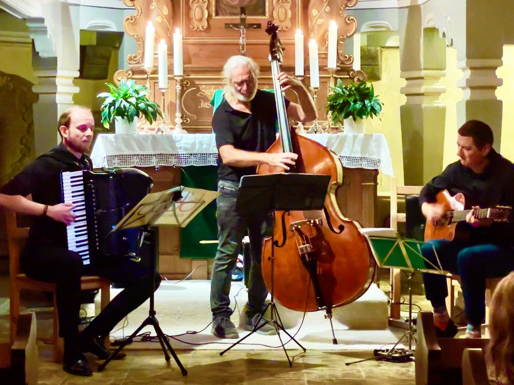 Am 20. September um 21:00 Uhr fand das zweite Hallersteiner Nachtkonzert 2025 statt: Das Di.M.A. Jazz-Trio, bestehend aus Dmytro Basarap (Gitarre), Adrian Stieglitz (Akkordeon) und Manfred Auer (Kontrabass), spielte Sinti-Swing der Extraklasse. Die Veranstaltung des Tonkünstlerverbands Hochfranken e.V. in Kooperation mit der Evangelischen Kirchengemeinde Hallerstein unter der Gesamtleitung von Christopher von Mammen. wurde zu einem vollen Erfolg. Die mehr als gut gefüllte Kirche schwärmte von einer tollen Stimmung und großer Perfektion. Wir hoffen, das Ensemble wird die Region bald wieder mit einem Konzert bereichern. Herzliche Einladung zum nächsten und damit dritten Hallersteiner Nachtkonzert 2025 am 27. September in den Stadtteil Hallerstein der hochfränkischen Stadt Schwarzenbach an der Saale! 21:00 Uhr kommt dann das bereits vielfach gefeierte Duo KlAkk! mit Ji Eun Kim (Klarinette) und Harald Oeler (Akkordeon). Sie spielen Werke von Johann Sebastian Bach und Harald Oeler. Herzlieche Einladung!