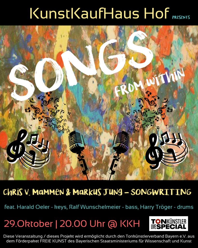 Christopher von Mammen und Markus Jung geben zusammen einen Abend eigener Songs. Als Band wirken Harald Oeler (Keys), Ralf Wunschelmeier (Bass) und Harry Tröger (Drums) mit! Im KKH / KunstKaufHaus Hof (Königsstraße 25, 95028 Hof) können Sie am Mittwoch, dem 29. Oktober 2025 um 20:00 Uhr eine ganz andere Seite des Saxophonisten und des Cellisten kennenlernen. Der Eintritt beträgt 15,-Euro. Herzliche Einladung! Eine Veranstaltung der Reihe „Tonkünstler Live Special“ des Tonkünstlerverbandes Bayern e.V., die vom Tonkünstlerverband Hochfranken e.V. unterstützt wird. Diese Veranstaltung wurde ermöglicht durch den Tonkünstlerverband Bayern e.V. aus dem Förderpaket FREIE KUNST des Bayerischen Staatsministeriums für Wissenschaft und Kunst.