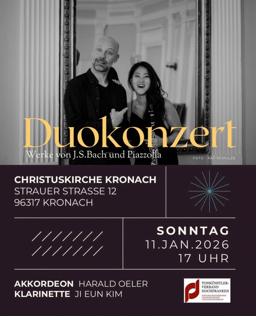 Das Duo KlAkk! – bestehend aus Ji Eun Kim (Klarinette) und Harald Oeler (Akkordeon) – gastiert schon Anfang Januar in Kronach! Am Sonntag, dem 11. Januar 2026 um 17:00 Uhr spielt das Ensemble in der Christuskirche. Es handelt sich um das erste Konzert des Ensembles in dem noch jungen Jahr mit Werken von Bach und Piazolla. Freuen Sie sich auf spannende Musik hochgelobter Instrumentalisten – das Konzert findet in Kooperation mit dem Tonkünstlerverband Hochfranken e.V. statt, die Christuskirche befindet sich in der Strauer Straße 12 in 96317 Kronach.