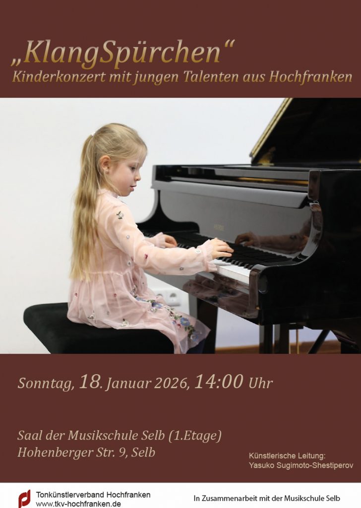 Die nächsten Klangspürchen finden am Sonntag, dem 18. Januar 2026 in Selb statt. Beginn ist 14:00 Uhr. Das Konzert ist im Saal der Musikschule Selb (Musikschule Selb: Hohenberger Straße 9(b), 95100 Selb). Dieser befindet sich in der 1. Etage. Es werden Wettbewerbsbeiträge für den anstehenden Regionalwettbewerb „Jugend musiziert“ Hochfranken geboten. Herzliche Einladung! Der Eintritt ist frei!