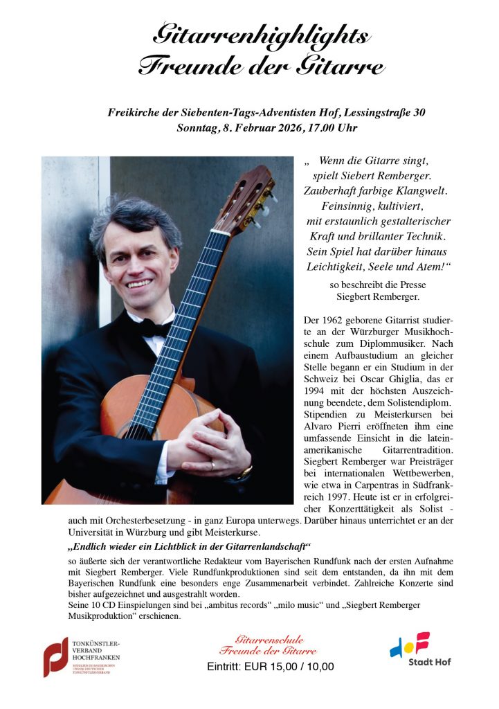 Beim nächsten der internationalen Gitarrenhighlights unter der Leitung von Dietmar Ungerank, dem 19. Konzert seit 2023 und dem ersten in diesem Jahr, kommt der international hoch geschätzte Konzertgitarrist Siegbert Remberger aus Deutschland zu uns! Er wird in seinem Programm u.a. Musik der Beatles, Dietmar Ungerank und Astor Piazzolla präsentieren und macht den Anfang der 2026er Fortführung dieser renommierten hochfränkischen Konzertreihe der Highlights! Siegbert Remberger schafft in seinen Konzerten eine zauberhaft farbige Klangwelt. Sein Spiel ist feinsinnig kultiviert, mit erstaunlich gestalterischer Kraft und brillanter Technik.