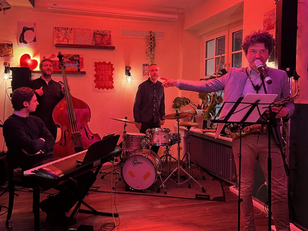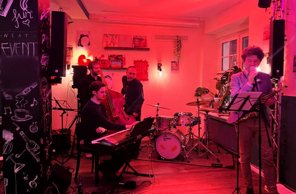 Am 12. Januar 2026 präsentierten die Hof Jazz Nights ein neues Format für ihre Fans: den Jazz Monday! Der erste Jazz Monday fand in Hofs erstes Studierendencafé „Zur Auszeit“ (Karolinenstraße 30, 95028 Hof) statt. Das Konzert startete um 20:00 Uhr bei freiem Eintritt statt. Unser Wunsch war es, den Bürgerinnen und Bürgern der Stadt Hof regelmäßig Konzerte mit Jazz- und Unterhaltungsmusik anzubieten. Diese Initiative der Hof Jazz Nights ist eine Veranstaltung des Tonkünstlerverbands Hochfranken e.V. in Zusammenarbeit mit dem Studierendencafé „Zur Auszeit“. Es spielten Sławek Dudar (Saxophon), Konrad Buschhütter (Klavier), Russell Snyder (Bass) und Paweł Czubatka (Schlagzeug).