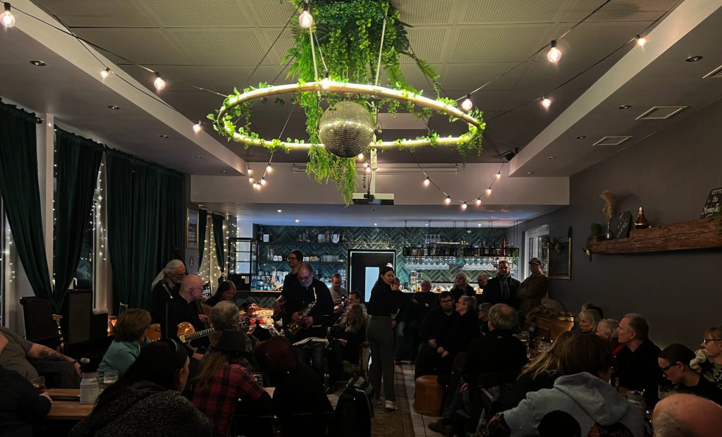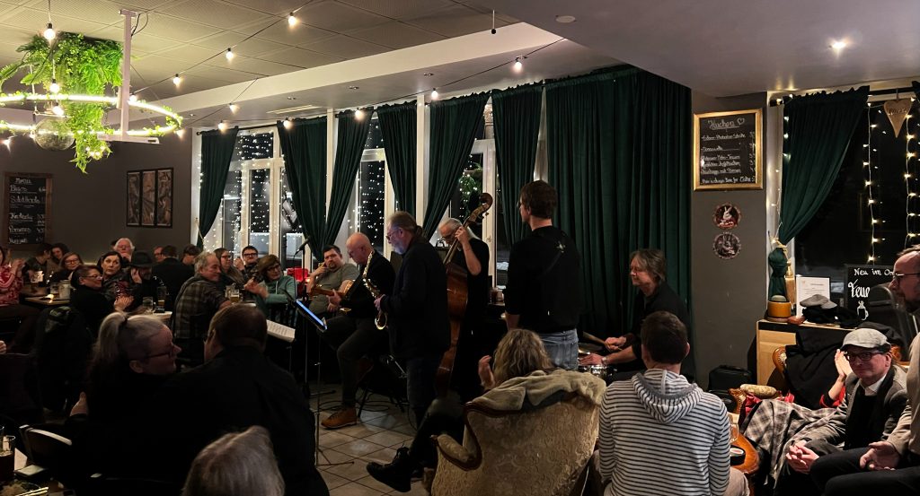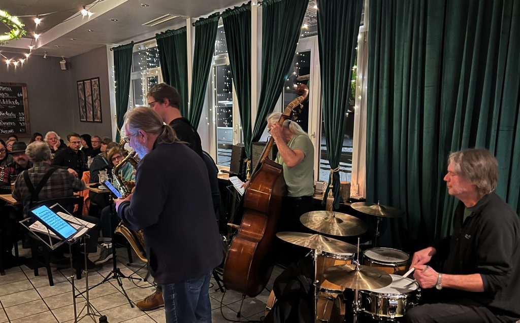 Am Donnerstag, dem 22. Januar 2026, um 20:00 Uhr ging es dann los – und knüpfte da an, wo im Dezember aufgehört werden musste. Die erste Stunde spielte die feste Bandbesetzung, bestehend aus Christopher von Mammen (Saxophon), Bernd Schricker (Saxophon), Thomas Motschmann (Gitarre), Manni Auer (Kontrabass) und Harry Tröger (Schlagzeug). Ab 21:00 Uhr waren dann spontane Mitspieler*Innen willkommen. Eine Sängerin und mehrere Jazzer aus Kulmbach waren unter anderem am Start und feinste Jazz-Vibes und humorvolle Klangexperimente waren das Ergebnis.