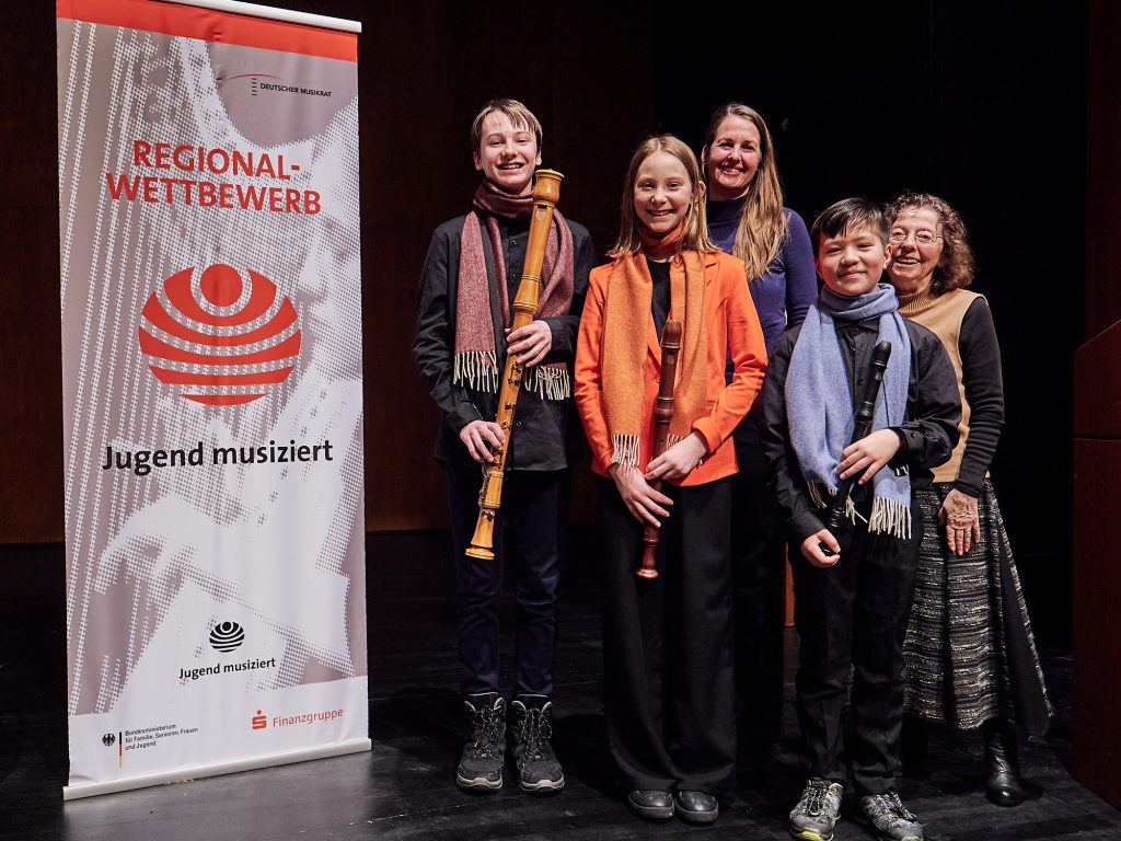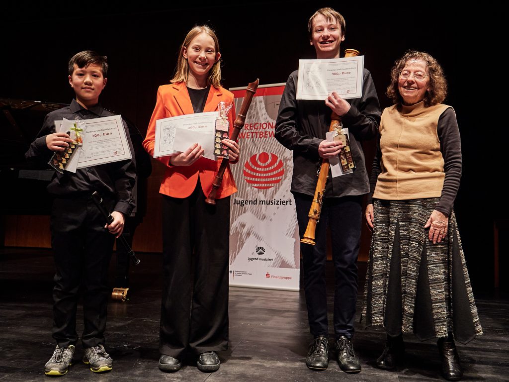 Zahlreiche Darbietungen mit Höchstpunktzahl wurden auch dieses Jahr beim 63. Regionalwettbewerb „Jugend musiziert“ Hochfranken wieder erreicht, und es war uns eine besondere Freude, dass sich auch ehemalige Preisträgerinnen und Preisträger in diesem Jahr wieder beachtliche Ergebnisse erspielt haben. Wie jedes Jahr lobte der Verband einen Sonderpreis – den ‚Florestan und Eusebius-Preis‚ – für besondere hochfränkische Talente aus. Er ist ein Sonderpreis zur Förderung junger Musikerinnen und Musiker aus der Region Hochfranken und beinhaltet einen Geldwert in Höhe von insgesamt 300,- Euro sowie drei Auftrittsmöglichkeiten in Konzerten unseresTonkünstlerverbandes. Der Name des Preises wurde durch den Komponisten Robert Schumann und den regional wichtigen Schriftsteller und Dichter Jean Paul inspiriert. Christa Klie, stellvertretende Vorsitzende des Tonkünstlerverbandes Hochfranken e.V., kam am Sonntag, dem 01. Februar 2026, um 17:00Uhr in Vertretung des 1. Vorsitzenden Markus Jung, den sie aus terminlichen Gründen leider entschuldigen musste, in das Rosenthal-Theater Selb, um drei jungen MusikerInnen eines Blockflöten-Ensembles diesen Sonderpreis zu verleihen, für den sie auch die Ansprache hielt.