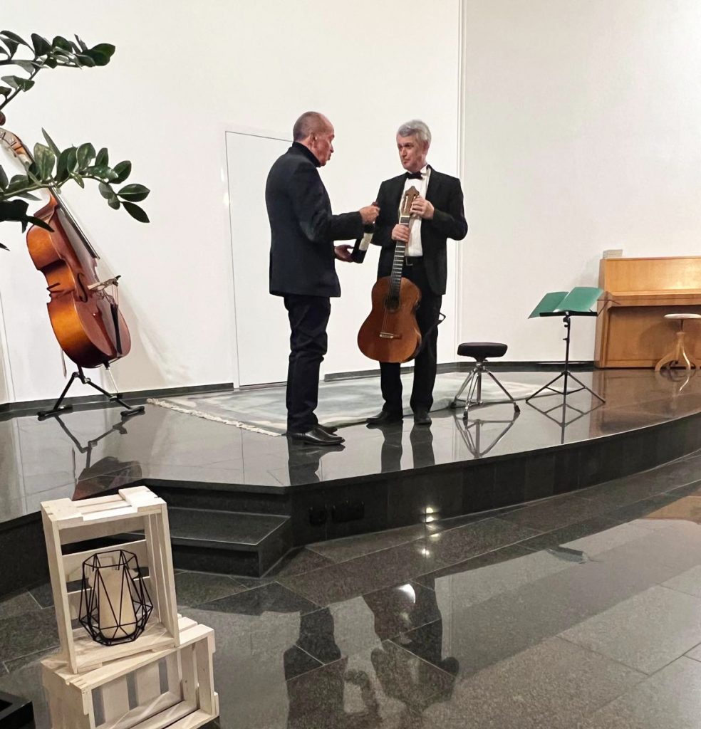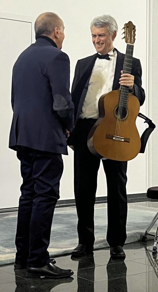 Gesamtleiter Dietmar Ungerank gratuliert Siegbert Remberger nach dessen erfolgreichem Konzert (Foto: Freunde der Gitarre)