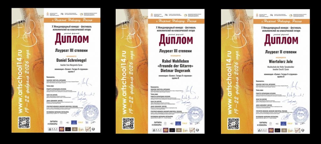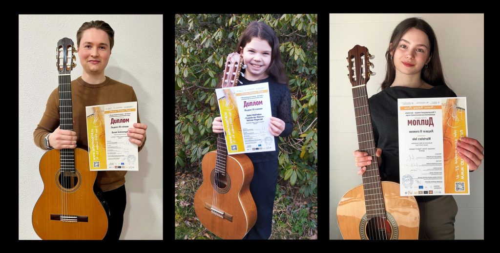 Herzlichen Glückwunsch den Preisträgern Jule Wirtelorz (Klasse Ewa Margareta Cyran, Musikschule der Hofer Symphoniker, 2. Preis), Rahel Wohlleben (Klasse Dietmar Ungerank, Gitarrenschule ‚Freunde der Gitarre‘, 3. Preis) und Daniel Schreivogel (Klasse Ewa Margareta Cyran, 3. Preis) sowie deren Dozenten und Eltern zu diesem tollen, internationalen Erfolg!