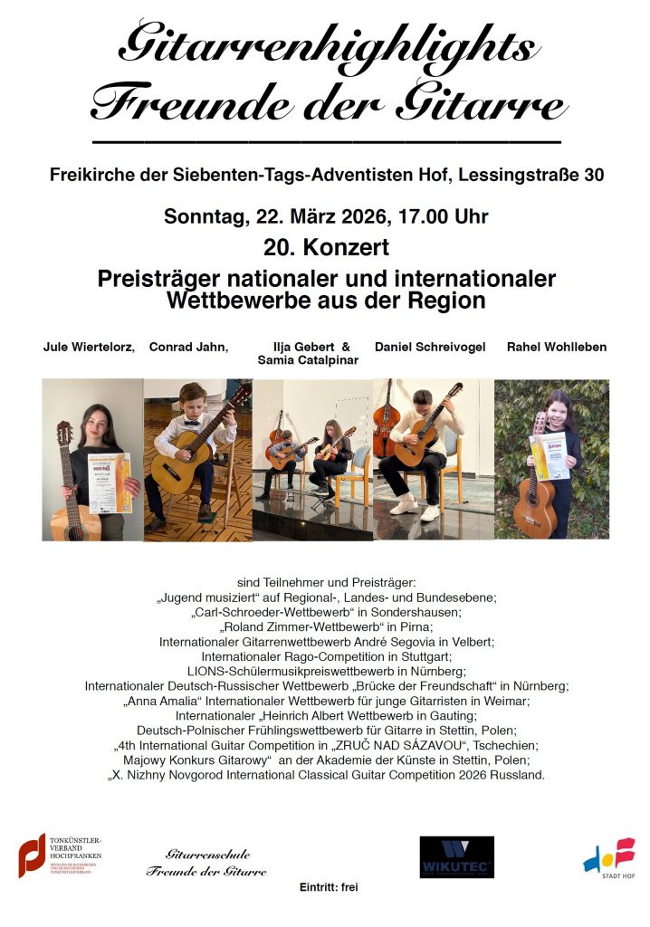 Die jungen Gitarristinnen und Gitarristen Jule Wirtelorz, Conrad Jahn, Ilja Gebert & Samia Catalpinar, Daniel Schreivogel und Rahel Wohlleben sind alle Preisträger nationaler und internationaler Wettbewerbe und kommen aus unserer Region. Sie nehmen Unterricht bei Dietmar Ungerank oder Ewa Margareta Cyran und haben in den letzten Jahren schon häufig auf sich aufmerksam gemacht. Daniel Schreivogel ist sogar zweifacherFlorestan und Eusebius-Preisträger„. Sie alle spielen nun im kommenden Gitarrenhighlight – dem 20. Konzert dieser Reihe und dem zweiten in diesem Jahr. Los geht es am Sonntag, dem 22. März um 17:00 Uhr. Damit geben die jungen Musiker der internationalen Reihe ein wunderbaresJubiläum und zeigen einmal mehr auf, dass die Welt der Gitarre in Hof einen festen und besonderen Platz hat. Das Konzert unter der Leitung von Dietmar Ungerank findet in der Freikirche der Siebenten-Tags-Adventisten in der Lessingstraße 30 in Hof statt, der Eintritt ist dieses Mal frei. Herzliche Einladung!