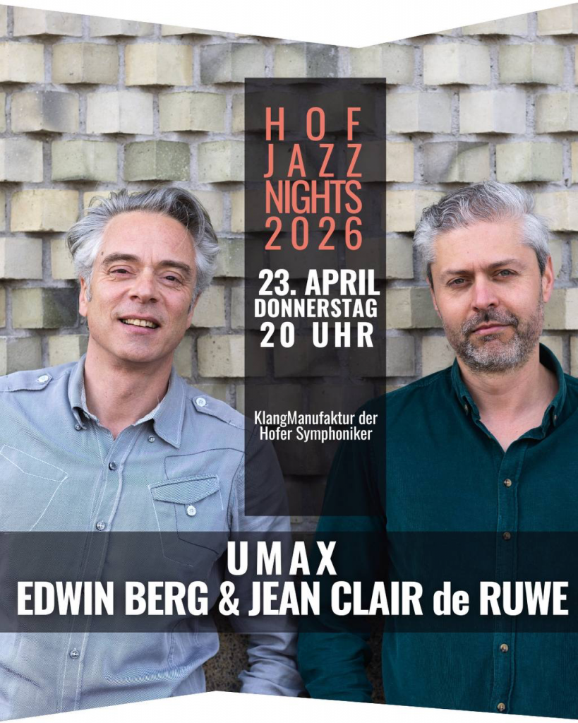 UMAX – UTRECHT MUSICAL AXPERIMENTS – ist ein niederländisches Jazz-Duo aus Edwin Berg (Klavier) und Jean Clair de Ruwe (Schlagzeug) und zu Gast bei den 4. Hof Jazz Nights. Sie spielen am Donnerstag, den 23. April 2026 um 20:00 Uhr in der KlangManufaktur der Hofer Symphoniker und werden dabei erstmals (!) ihre neue CD vorstellen, was das Duo sich extra für die Hof Jazz Nights vorbehalten hat. Darauf sind wir stolz und gespannt!