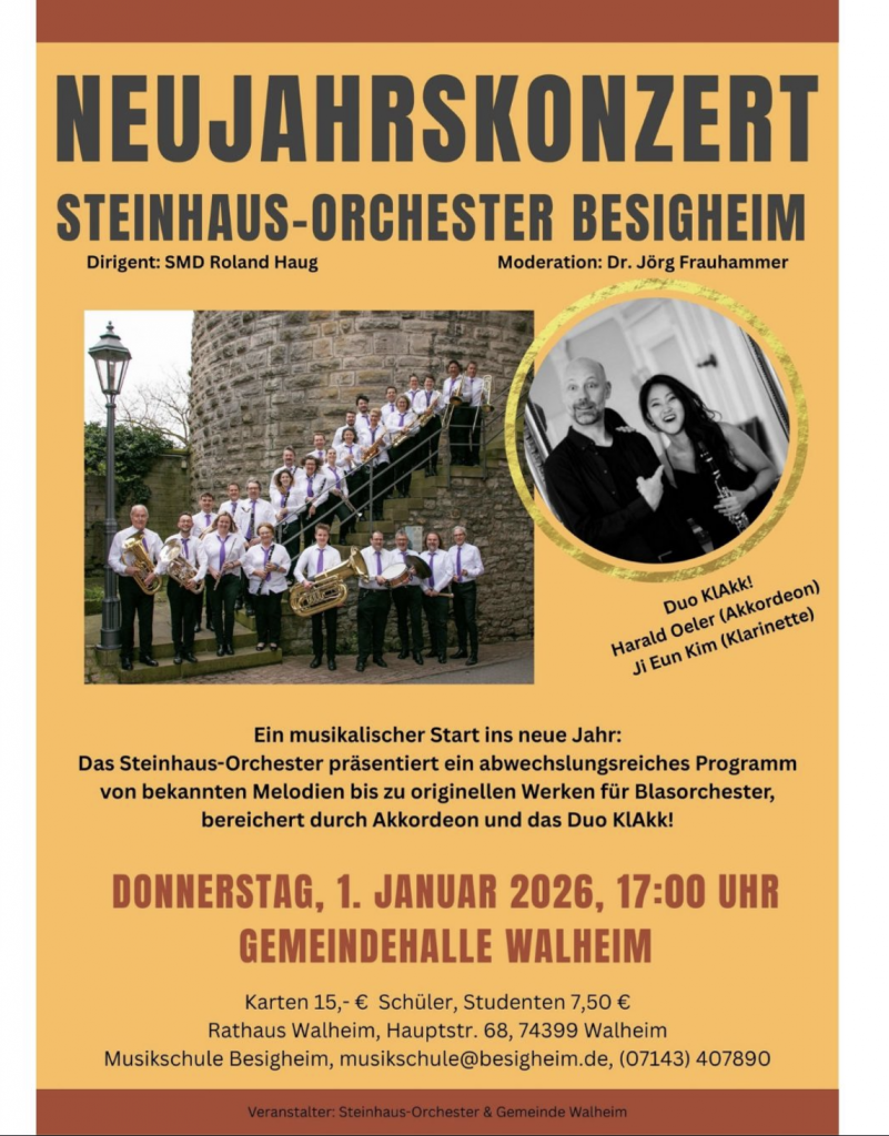 Neujahrskonzert mit dem Duo KlAkk! – bestehend aus Ji Eun Kim (Klarinette) und Harald Oeler (Akkordeon). Das Duo gastiert in Wahlheim! Am Donnerstag, dem 01. Januar 2026 um 17:00 Uhr spielt das Ensemble in der Gemeindehalle und vervollständigt dabei einen Blasmusik-Abend des Steinhaus-Orchesters Besigheim unter der Leitung von SMD Roland Haug. Moderiert wird das Neujahrskonzert von Dr. Jörg Frauhammer. Freuen Sie sich auf spannende Arrangements hochgelobter Instrumentalisten. Karten gibt es zu 15,-€ / ermäßigt 7,50€ (Schüler und Studenten). Herzliche Einladung!