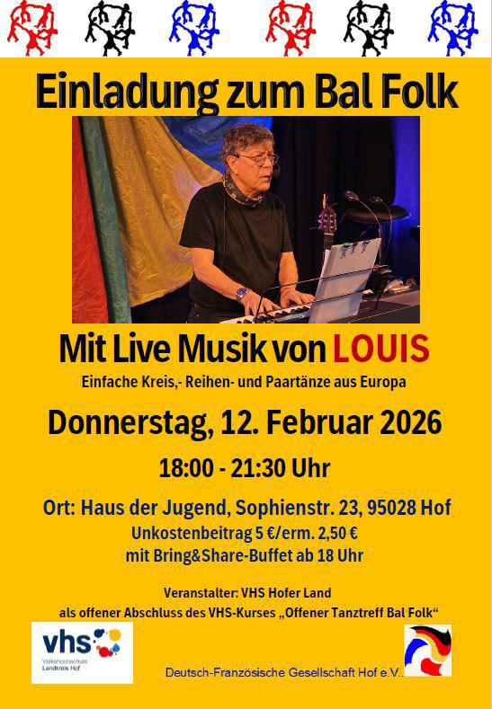 Lust auf Tanzen? Mal ganz anders? Lassen Sie sich am Donnerstag, dem 12. Februar 2026 mitreißen von einer besonderen Atmoshäre: einer Mischung aus Spaß, Musik, Freude an Bewegung und Geselligkeit! Beginn ist 18:00 Uhr, jeder bringt selbt etwas für das Buffet mit. Getränke werden zum Selbstkostenpreis verkauft. Ab 18:30 Uhr bis21:30 Uhr beginnt dann das Tanzen: Bal Folk mit Live-Musik von Louis. Louis ist vor allem in der Folk-Tanz-Szene bekannt für seine warme und einnehmende Stimme, begleitet mit seiner Gitarre oder am Piano. Als echtem Franzosen mit deutscher Wahlheimat gilt seine Liebe dem traditionellen französischen Chanson, dem er mit modernen Eigenkompositionen und nicht seltem einem Hauch von Country und Blues ganz neue Klangfarben verleiht. Um einen Unkostenbeitrag von 5,-€ (ermäßigt 2,50€) neben dem Bring&Share-Buffet wird gebeten. Veranstalter ist die VHS Hofer Land, die hier mit der Deutsch-Französischen Gesellschaft Hof e.V. kooperiert. Die herzliche Einladung zu einfachen europäischen Kreis-, Reihen und Paartänzen für alle bildet den offenen Abschluss des VHS-Kurses „Offener Tanztreff Bal Folk„.