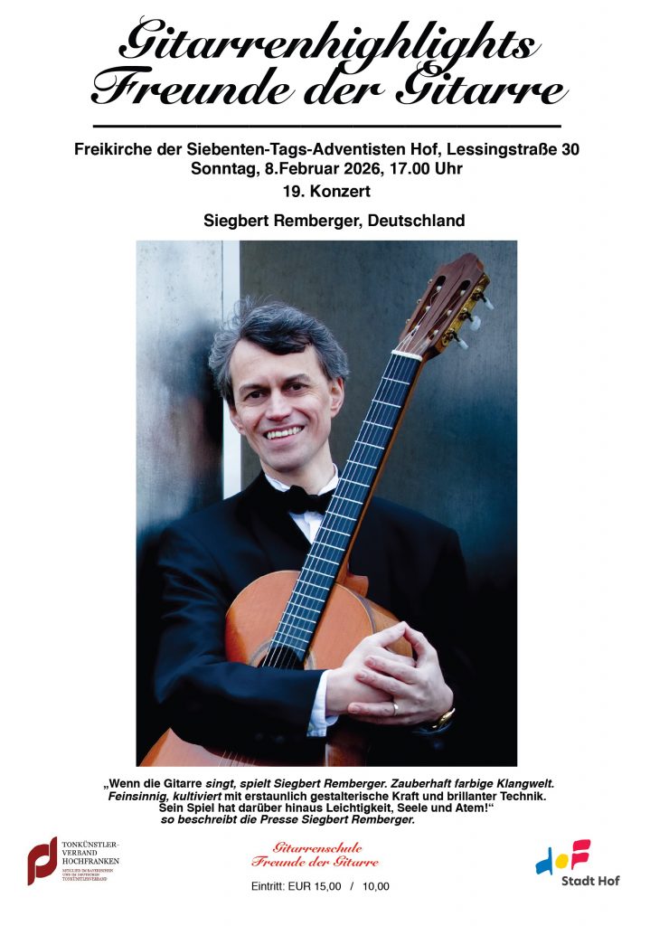Beim nächsten der internationalen Gitarrenhighlights unter der Leitung von Dietmar Ungerank, dem 19. Konzert seit 2023 und dem ersten in diesem Jahr, kommt der international hoch geschätzte Konzertgitarrist Siegbert Remberger aus Deutschland zu uns! Er wird in seinem Programm u.a. Musik der Beatles, Dietmar Ungerank und Astor Piazzolla präsentieren und macht den Anfang der 2026er Fortführung dieser renommierten hochfränkischen Konzertreihe. Der Eintritt kosten 15,-€ / 10,-€. Herzliche Einladung zu einem erneuten Highlight!